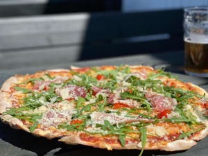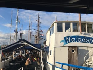Den gamla ångbåten Najaden ligger förtöjd invid L'Escale. På dagen är Najaden Sail-in-Pizzeria,